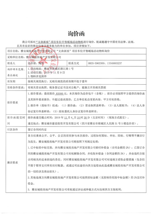 雅安城投房地產(chǎn)開發(fā)有限公司詢價(jià)函