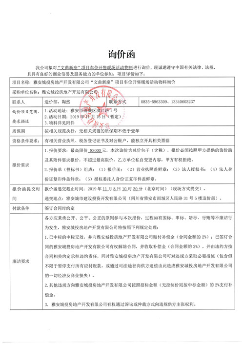 雅安城投房地產(chǎn)開發(fā)有限公司“文曲新座”項(xiàng)目車位開售暖場活動物料詢價函(第二次)