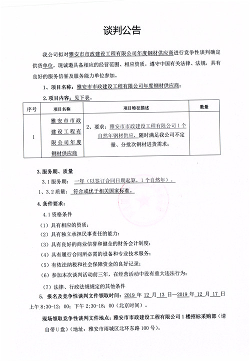 雅安市市政建設工程有限公司年度鋼材供應商競爭性談判公告