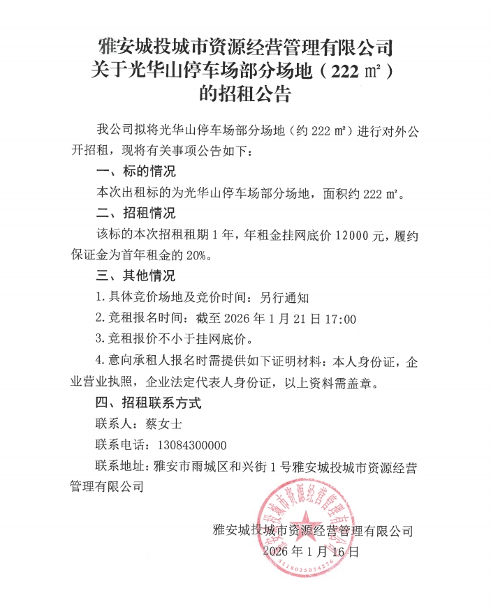 雅安城投城市資源經(jīng)營管理有限公司關于光華山停車場部分場地(222㎡)的招租公告