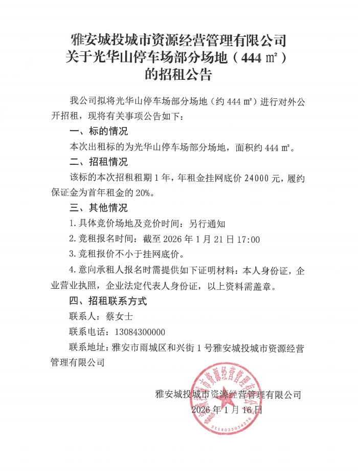 雅安城投城市資源經(jīng)營(yíng)管理有限公司關(guān)于光華山停車(chē)場(chǎng)部分場(chǎng)地(444㎡)的招租公告