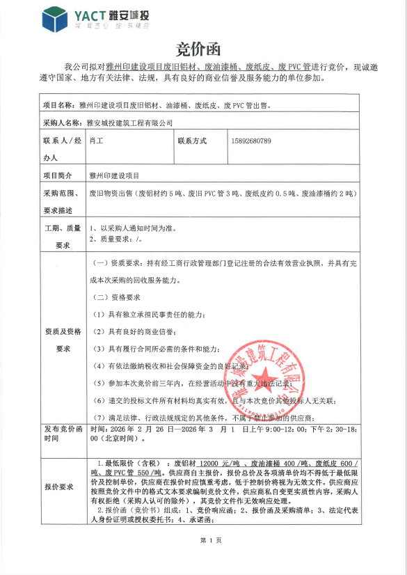 雅州印建設(shè)項目廢舊鋁材、油漆桶、廢紙皮、廢PVC管出售
