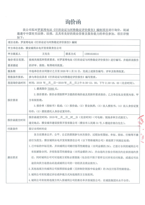 羅家灣電站《行洪論證與河勢穩(wěn)定評(píng)價(jià)報(bào)告》編制詢價(jià)函