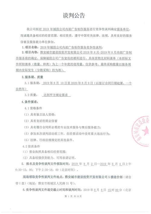 2019年城投公司內(nèi)部廣告制作服務競爭性談判公告