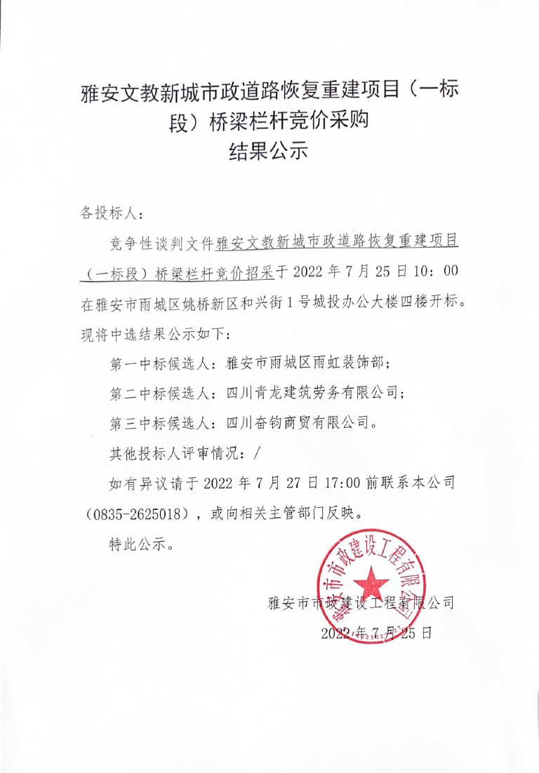 雅安文教新城市政道路恢復(fù) 重建項目競價(一標(biāo)段)橋梁欄桿競價采購結(jié)果公示