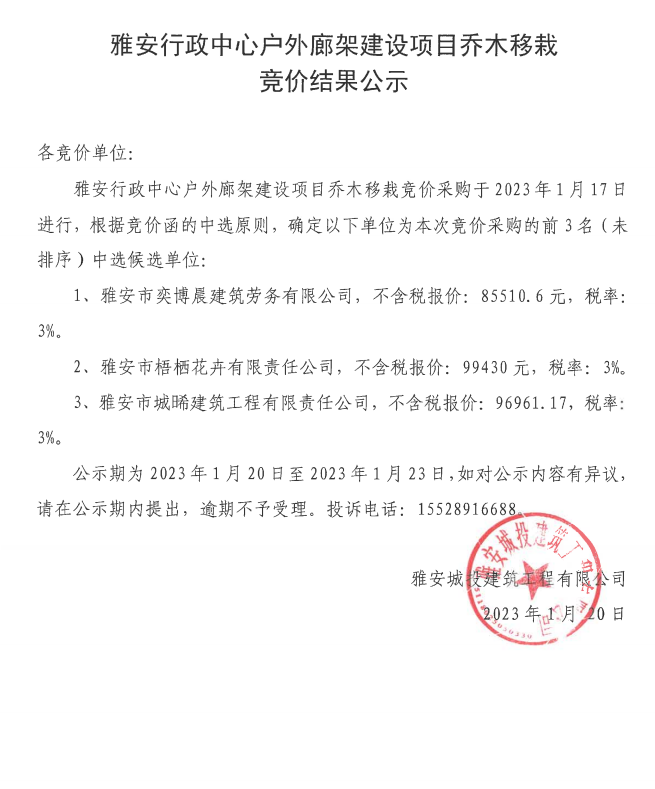 雅安行政中心戶外廊架建設(shè)項(xiàng)目喬木移栽競(jìng)價(jià)結(jié)果公示