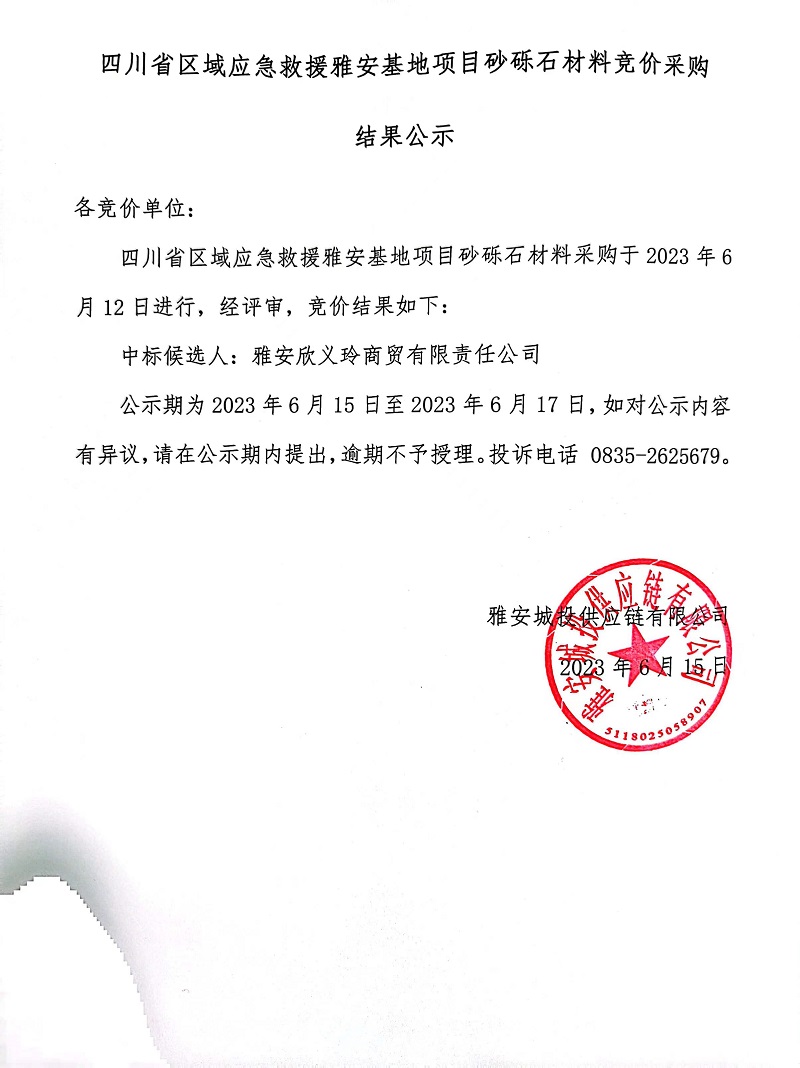 四川省區(qū)域應急救援雅安基地項目砂礫石材料競價采購結果公示