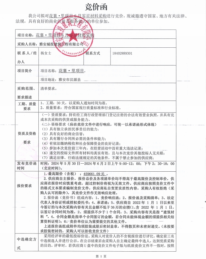 花襄·里項目6月零星材料采購競價公告