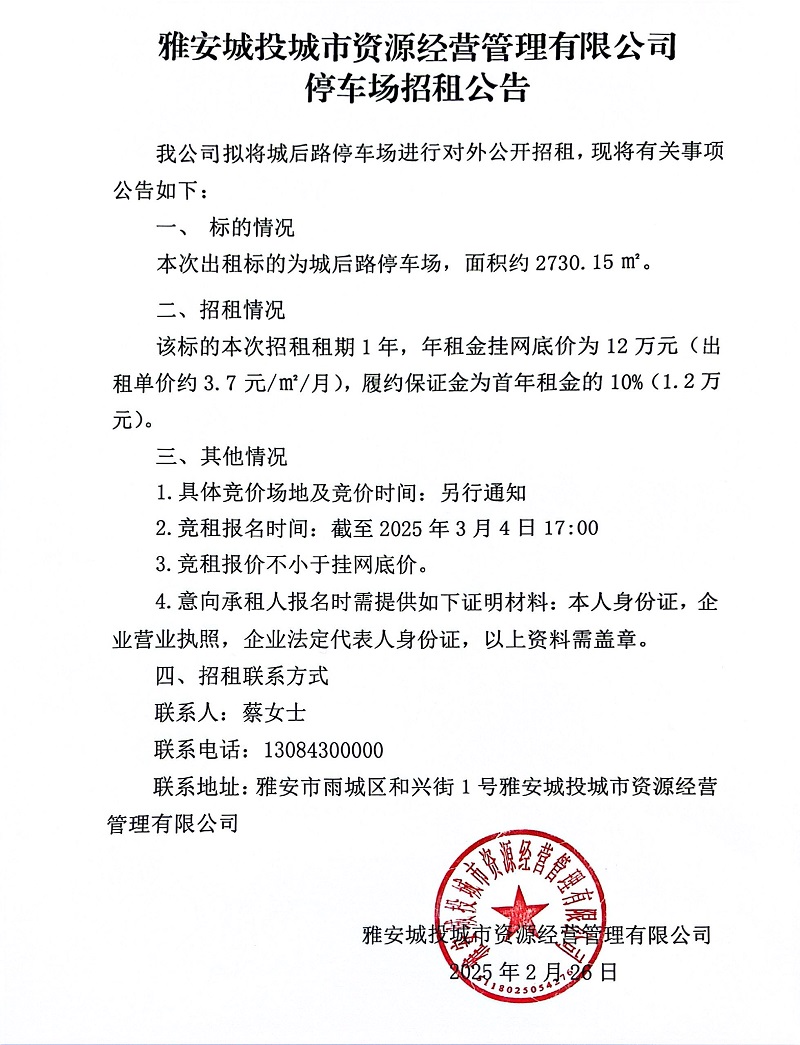 雅安城投城市資源經(jīng)營管理有限公司停車場招租公告