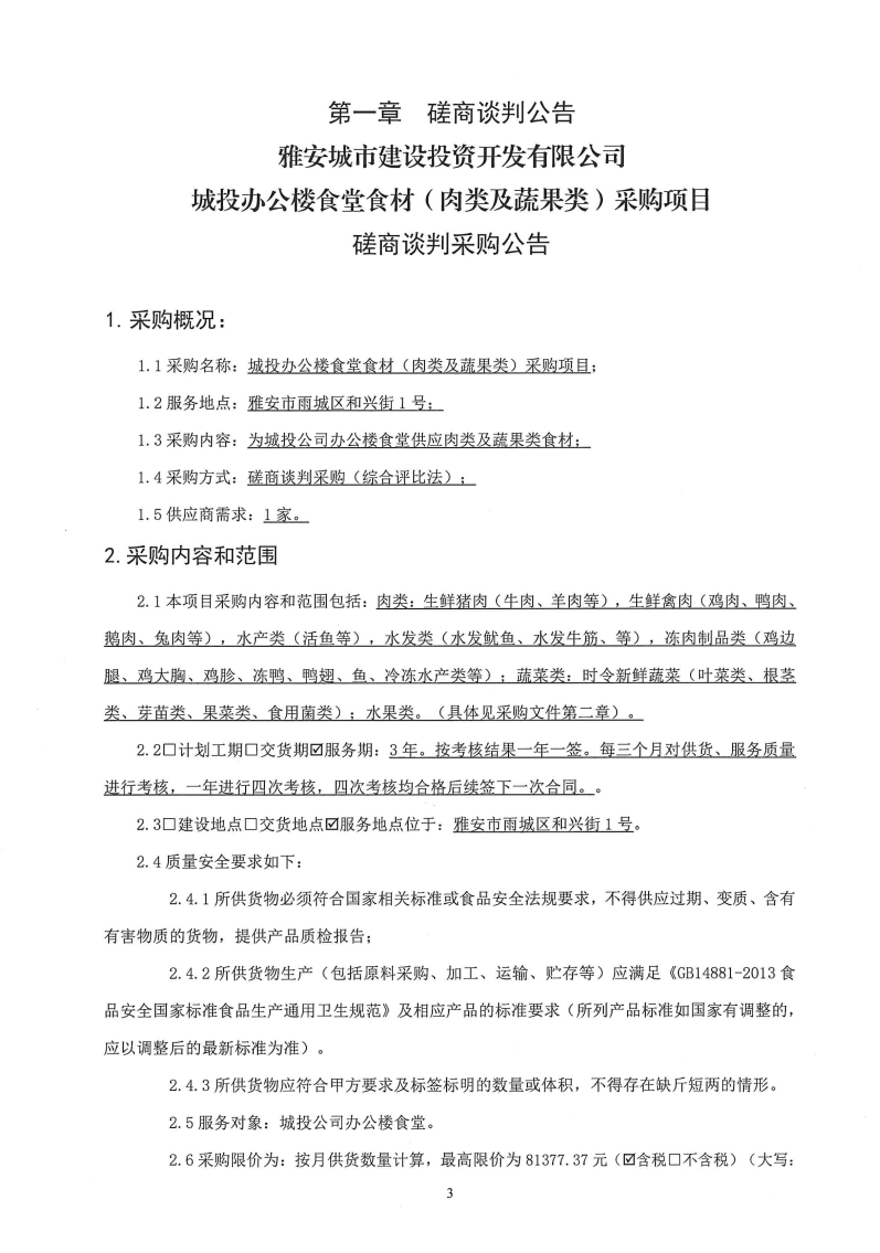 雅安城市建設投資開發(fā)有限公司城投辦公樓食堂食材(肉類及蔬果類)采購項目磋商談判采購公告