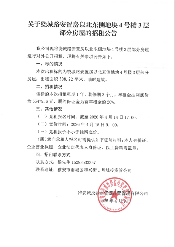 關于繞城路安置房以北東側(cè)地塊4號樓3層部分房屋的招租公告