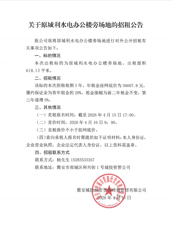 關(guān)于原城利水電辦公樓旁場地的招租公告