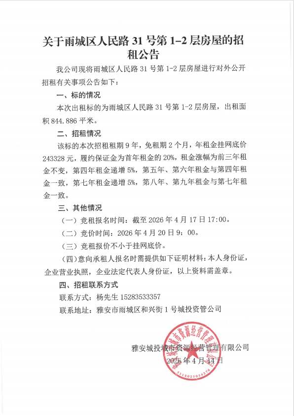 關(guān)于雨城區(qū)人民路31號(hào)第1-2層房屋的招租公告